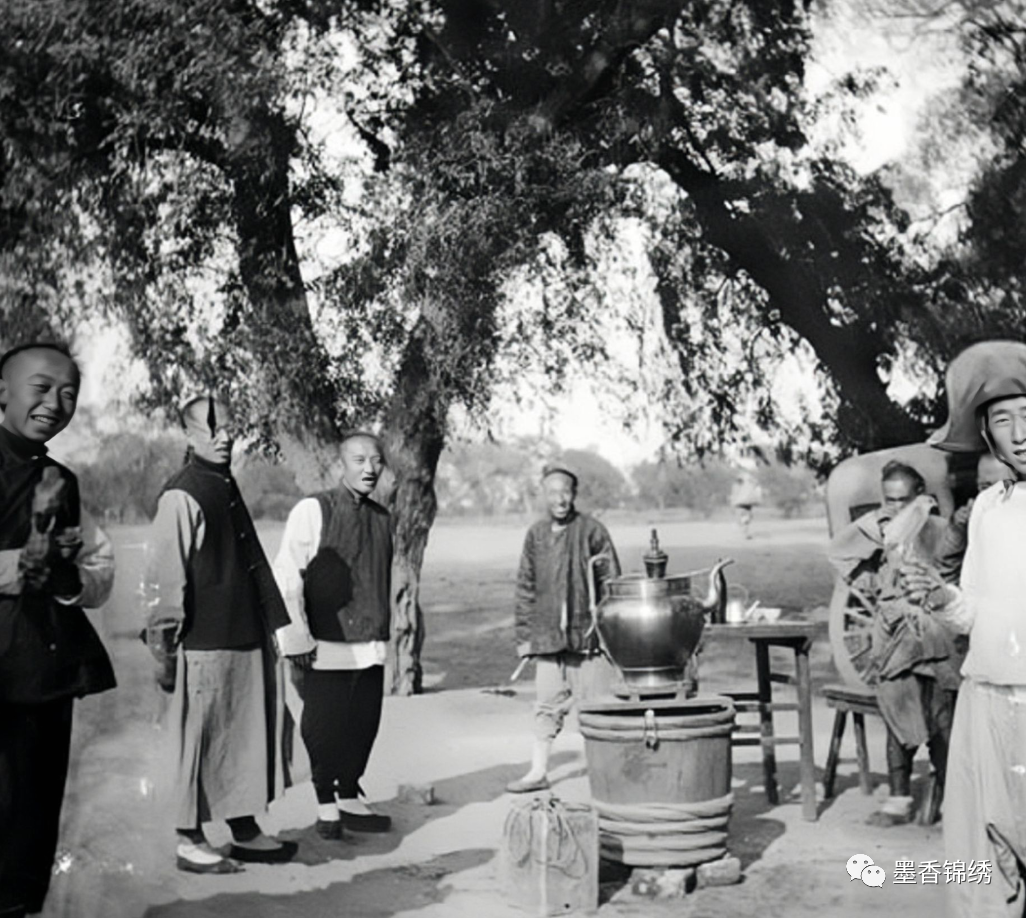 晚清年间奉天一带的清北陵附近入口处的茶摊旧照,众所周知清北陵乃是晚清皇家陵园。清朝的开国皇帝皇太极和孝端文皇后的棺椁皆被埋葬于此,原本旧时清廷派有专人看守维护。然而自晚清朝廷衰败之后,此地便是逐渐萧条没落,时常有小贩到此地附近摆摊卖茶,以便赚取一些微薄的铜细养家糊口。