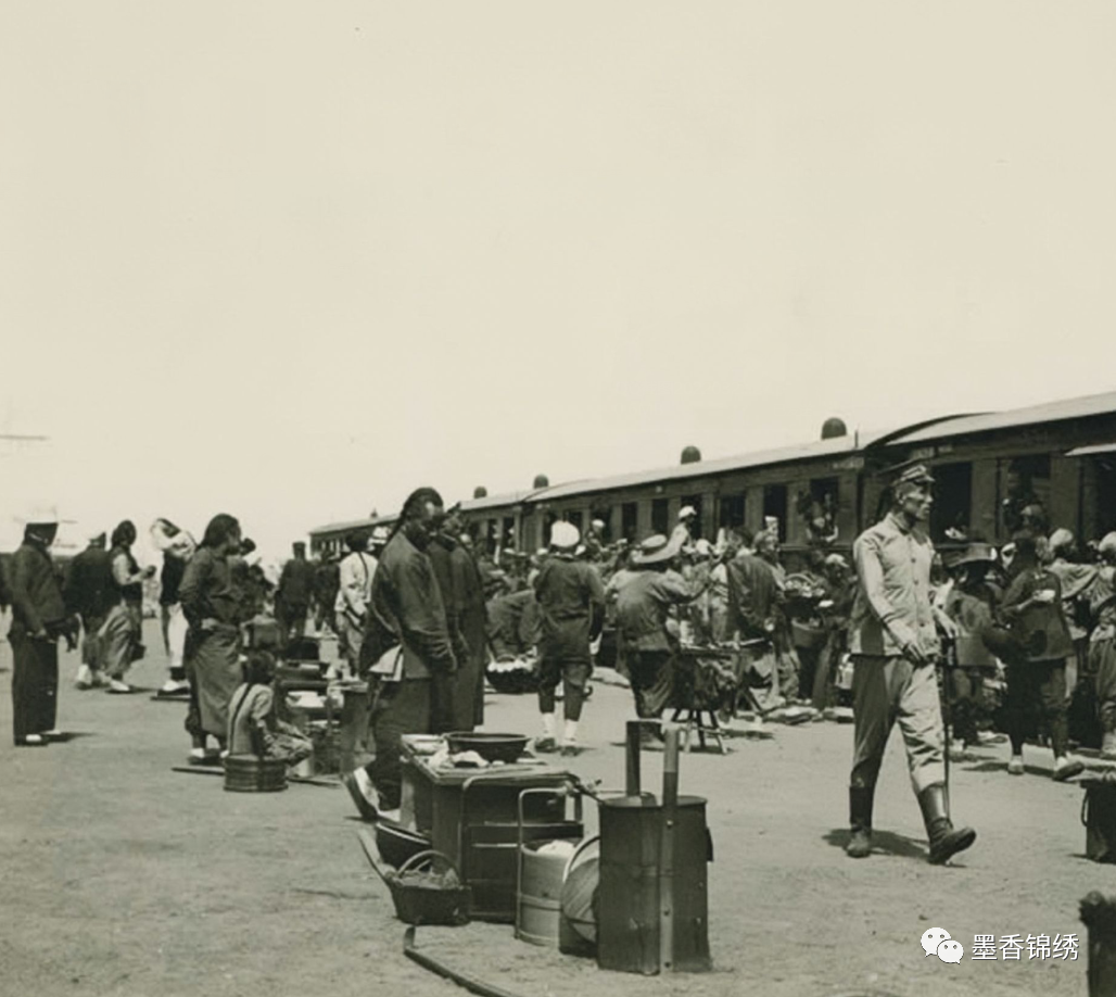 晚清年间辽宁锦州的沟帮子火车站一幕,据悉这沟子帮火车站建于晚清1899年之时,乃是沟海铁路与沈山铁路之间的重要枢纽之地。老照片中的沟子帮火车站人来人往十分热闹,不远处还有各式小贩在兜售摊前的商品。人们赶路坐车匆匆,一副生活忙碌的浓郁气息。