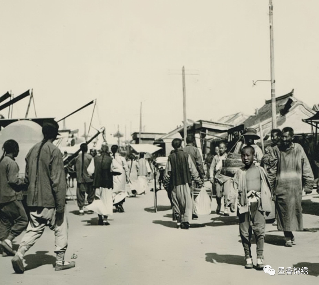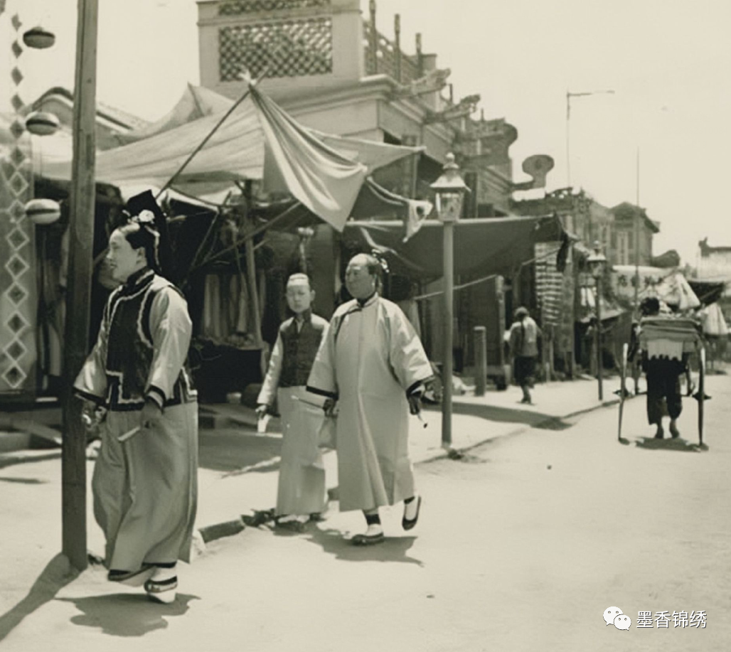 晚清年间一位住在京城里的花甲老汉带着孙子徒步逛街的留影旧照,老照片中的街道虽然不是京城里最为繁华之地,但是其中已有电线杆和路灯出现,可见此地的现代化发展迅速之快。对比之下,留着长辫子的晚清男子,与充满现代化气息的建筑路灯,两相比较是否另有一番滋味在心头。