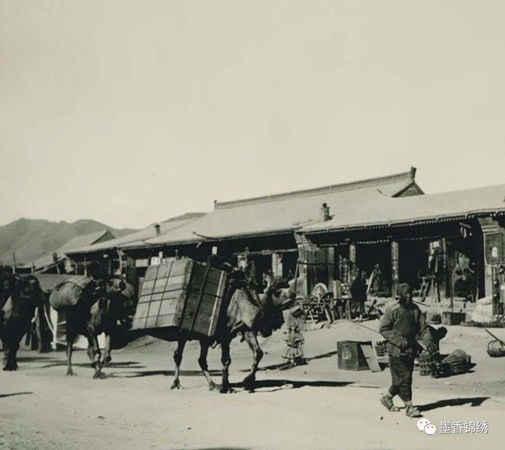 晚清末年张家口大街上的驼队运输队旧照,老照片中的骆驼乃是当时运输物资的重要交通工具,因此其身上大多数驮着大量的货物。当时的驼商主要往来蒙古边境之地,长途跋涉的运输之路非车马可行,唯有骆驼队能久扛劳苦运输前行。