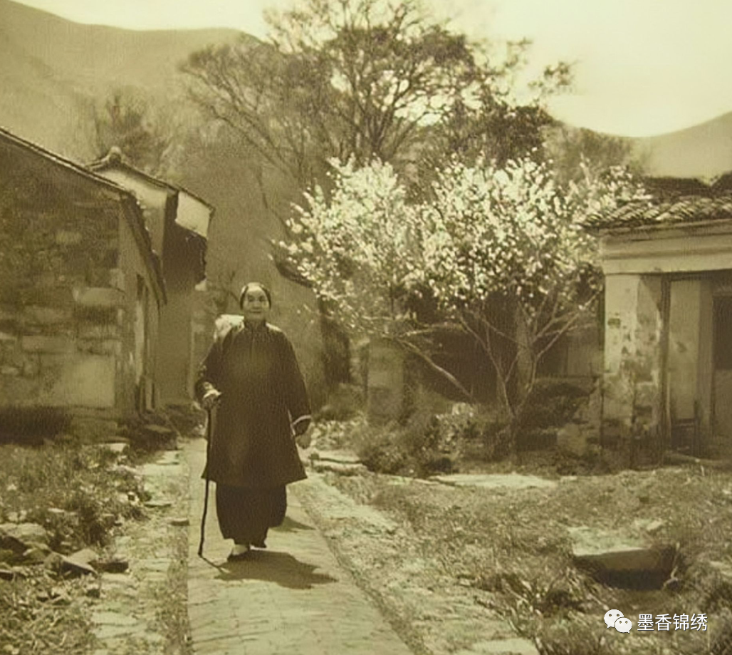晚清时期住在江南水乡的村庄老人的肖像旧照,彼时正是春意料峭桃花盛开之时,因此老照片中的小路上满是艳丽多姿的春季之花。不远处的年迈老人拄着拐杖,悠闲地走在乡间小路上,让人忍不住想起小时候在家乡温情满满的一幕。