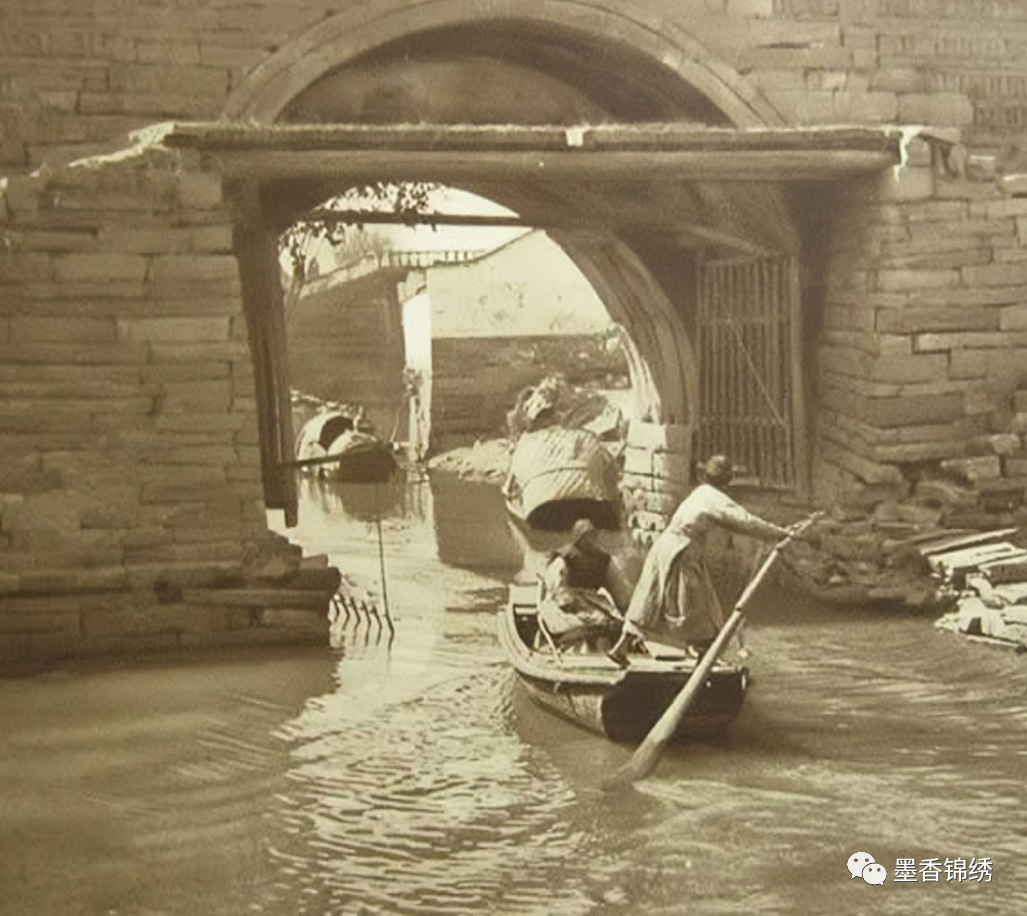 晚清年间一位老汉摇船奋力穿过城墙水门的罕见旧照,旧时的江南之地多是水乡舴舟,人们出行亦是多为乘船而去。而且彼时的江南城内的城墙除了有供车马通行的陆门以外,而且亦是建造了供舴舟小棹出行的水门之路。而这城墙水门一是为了便于城内的水域流通起来防止变质,二来则是为了在遇到紧急时期关闭水门方式水患之灾。