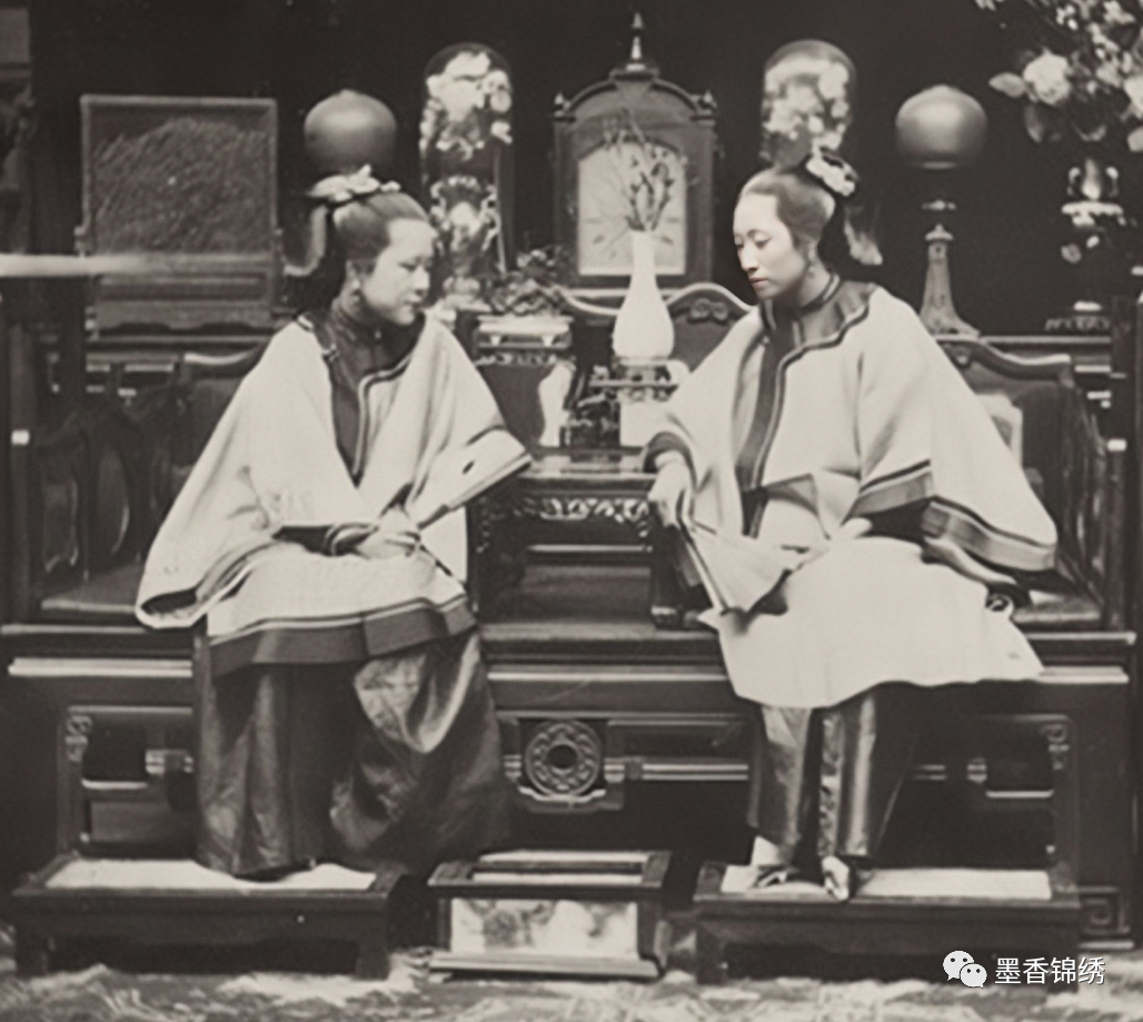 晚清年间广州城里一户有钱人家的原配与小妾的合影旧照,老照片中女眷皆都穿着锦绣华贵,坐在右边的年轻女子为偏房小妾。或许是碍于身份地位,年轻的小妾低头对原配夫人俯首称臣,一脸的恭敬与卑微,丝毫不敢有半点逾规之举。