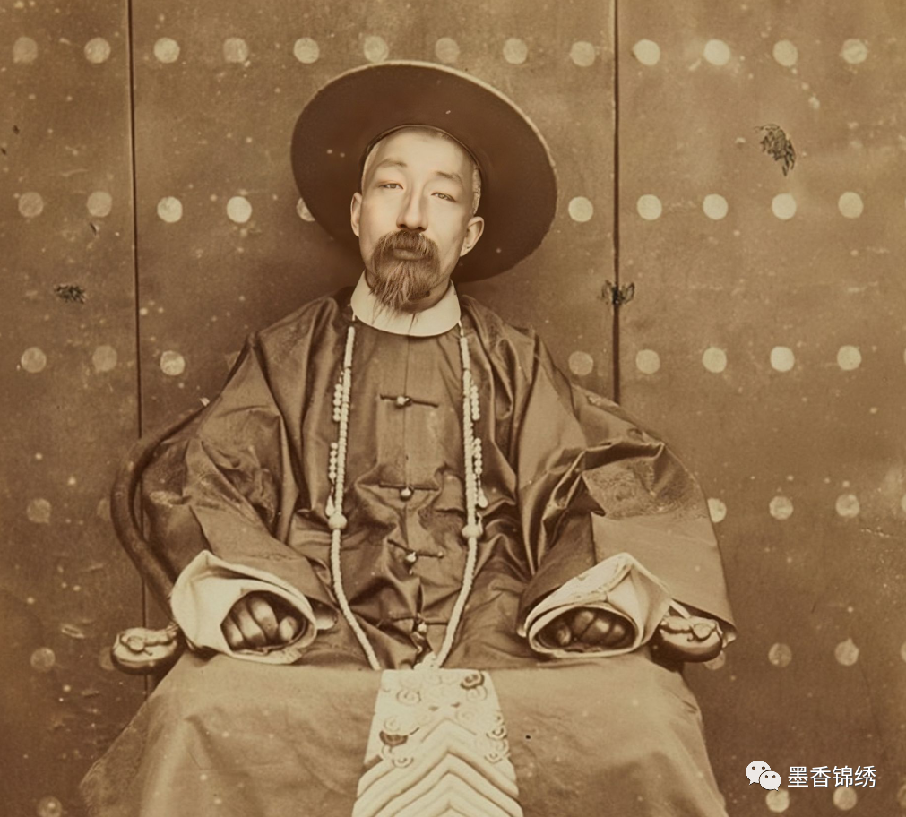 晚清末年一位守着衙门的七品县太爷的肖像旧照,老照片中的县太爷虽然项挂朝珠且衣着华贵锦绣,但是满脸的哀愁与忧郁,可见彼时的战乱亦是让他满心不安。其实清朝的大臣所挂的朝珠一共有一百零八颗,其中以文官五品和武官四品以上为界限,可用东珠、珊瑚等珠宝指着。而朝珠中最为高贵的东珠与明黄色则只有宫中皇帝与皇后所用。