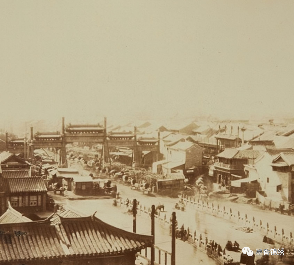 晚清年间京城里的前门一带的商业大街罕见旧照,众所周知彼时的京城前门大街其实是外城最为重要的商业地带。此处不但云集了各行各业的茶楼酒馆、商行当铺,就连风靡一时的青楼楚馆、戏院货栈等皆云集于此。大街上的商铺各自林立于旁,鳞次栉比而整齐有序,乃是京城里赫赫有名的繁华地带。