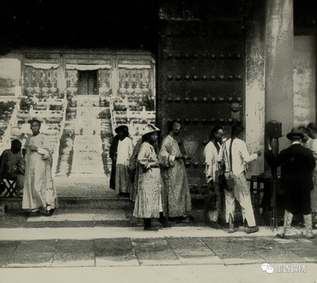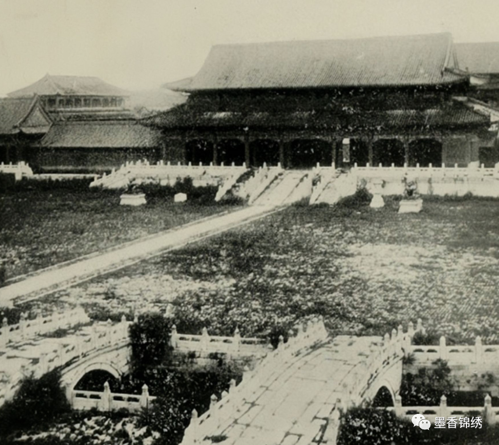 荒草萋萋的紫禁城内的太和门广场旧照,自慈禧太后带着光绪皇帝及嫔妃们逃离经常后,其城内只剩下少许的太监与宫女打扫维护。而曾经偌大的辉煌宫殿,竟在短短数月便变得破败荒凉,触目之处皆是被摧毁的断壁残垣,让人不禁想到了晚清即将面对的风雨飘摇之悲惨命运。