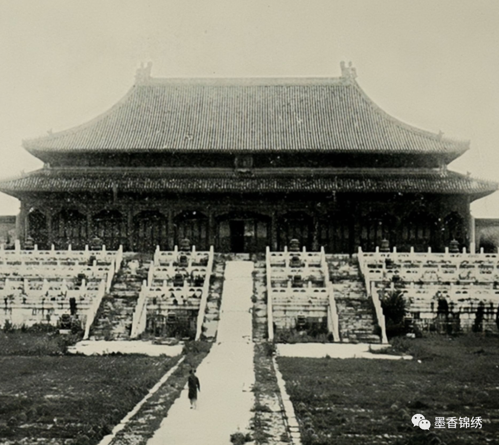 晚清末年的紫禁城太和殿的留影旧照,老照片中的太和殿荒草萋萋破败不堪。众所周知这太和殿乃是紫禁城里规模最大的殿宇,也就是我们所熟知的皇帝金銮殿。金銮殿的长宽为九比五,寓意帝王的九五之尊,代表皇帝有着至高无上的地位与权利。