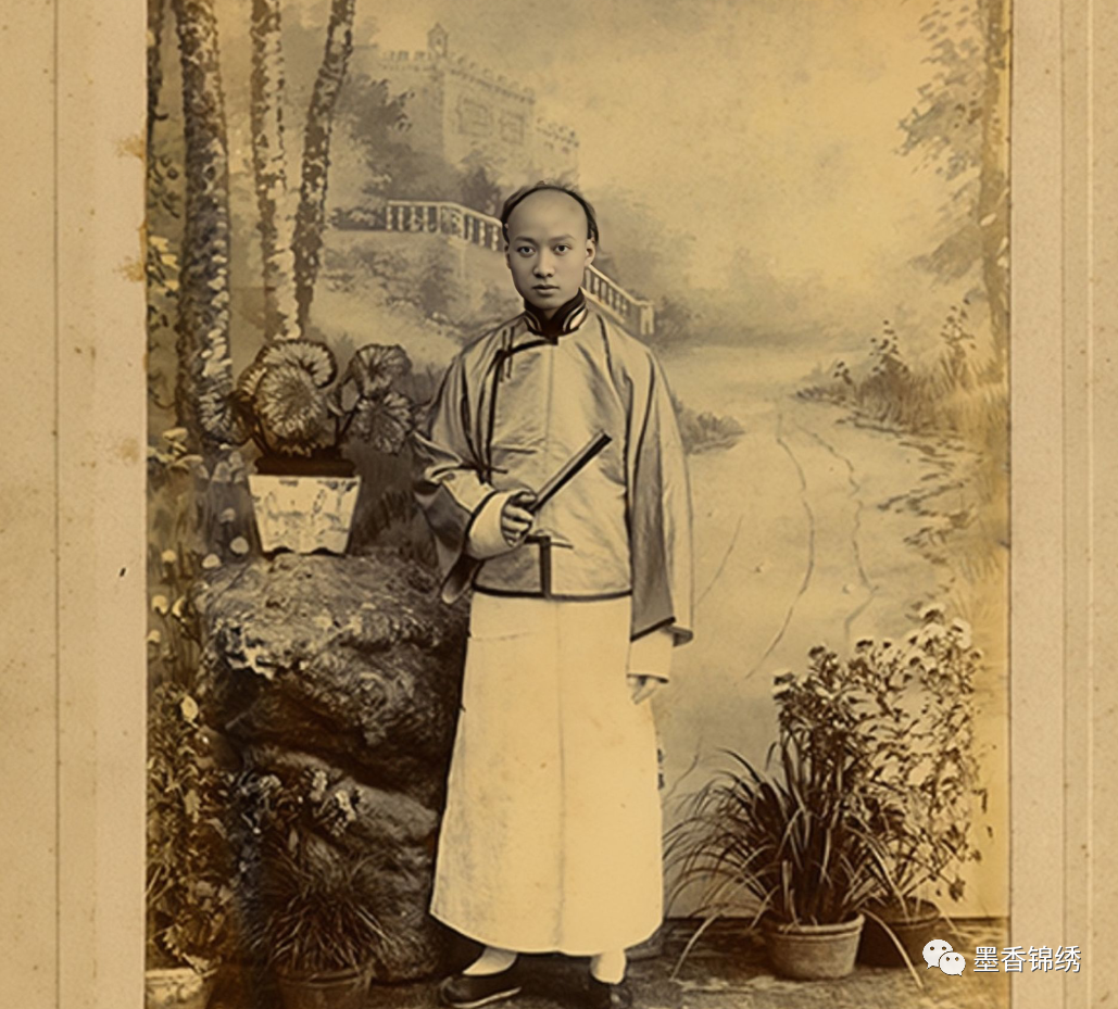 晚清年间一位有钱家的男子在上海宝记照相馆里的肖像旧照,彼时拍照费用非常昂贵不易,能走进照相馆拍照留念的大部分都是王公贵族或者文人雅士。再加上当时有些百姓对拍照谈虎色变,愿意花钱去拍照之人亦是细想毕竟开明之人。