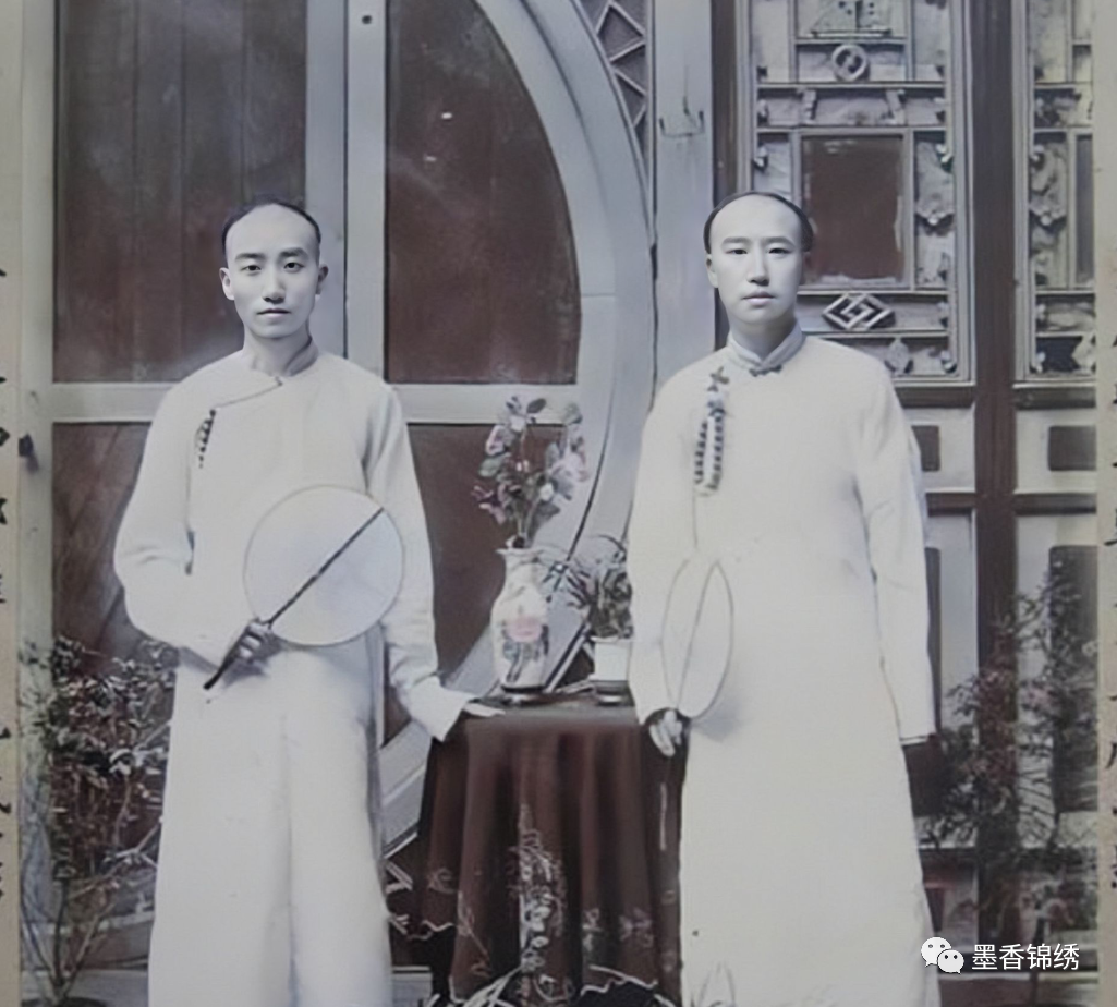 晚清年间两位富家公子并肩在黄鹤楼的合影老照片,根据该老照片文字注释,两位富家公子生于晚清时期大家族,站在左边的名为子婴,年龄正是而立之年。而右边的则是其同胞兄弟邮雏,刚满29岁。