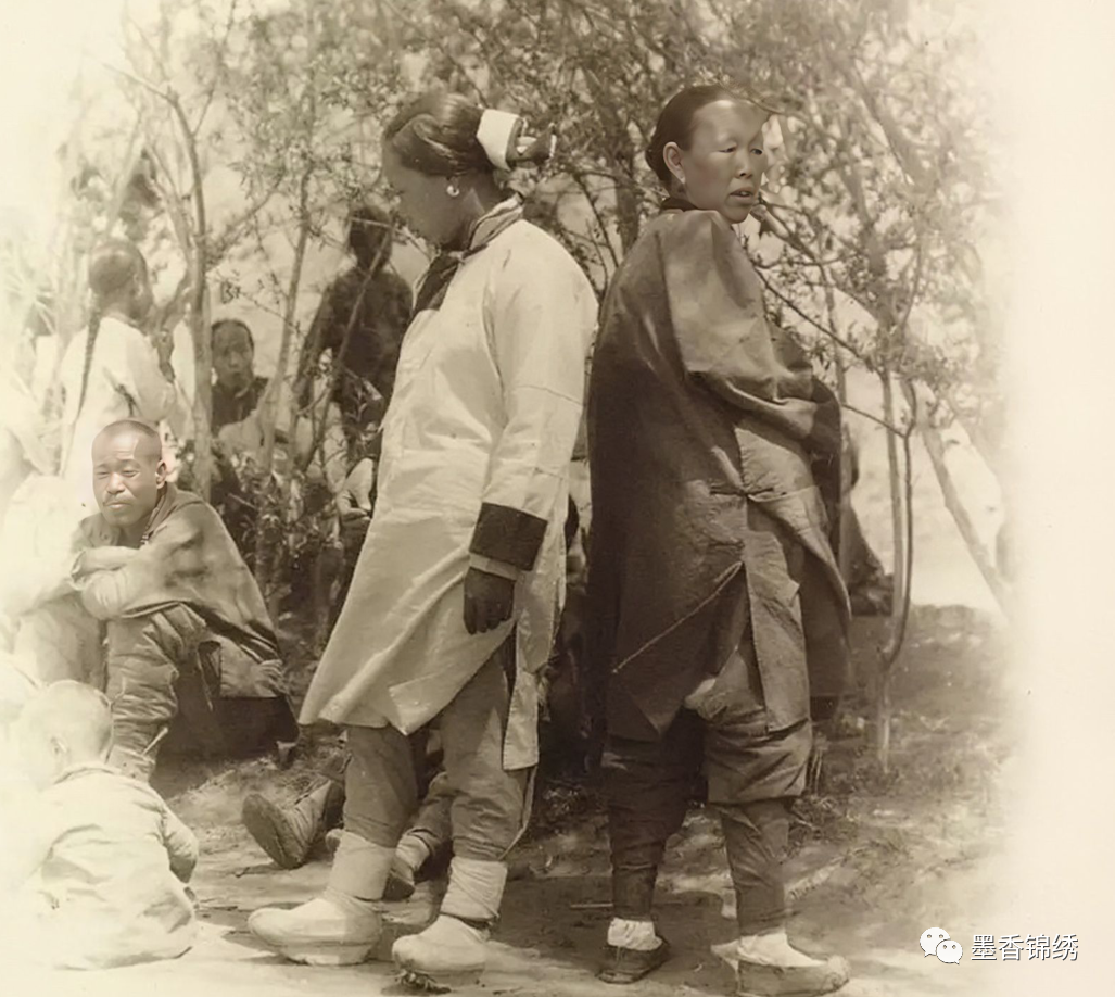 晚清年间一位原配与小妾背靠背微笑合影旧照,老照片中的两位女子穿着的鞋子为登云履,乃是晚清年间福建一带客家女子的穿着打扮。
