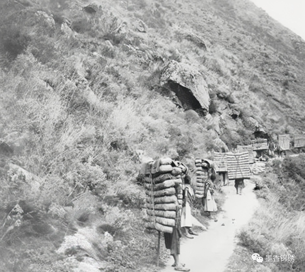 晚清1903年的四川境内的茶马古道上背茶叶的苦脚工,众所周知这茶马古道乃是西南地区专门贩卖茶马的互市,即买卖茶叶和购买战马之处。明清时期,四川的茶马古道尤为昌盛繁荣。虽然后来马匹的买卖逐渐衰落,但是同时茶叶买卖的贸易却迅速增长,成为当地民生主要的收入来源。
