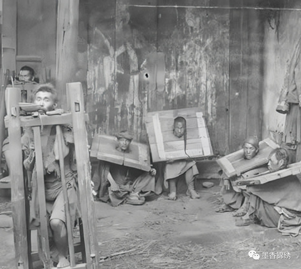 晚清1896年的云南昆明一带被判处枷锁刑罚和站笼的囚犯留影旧照,据悉这戴枷锁示众乃是晚清律例的规定官方刑罚。而其中所戴的枷锁重量及时长,皆有相应的律法规定。而站笼之罚则是法外之刑,并没有明确的律法概述,一切由各地的地方官设定即可。