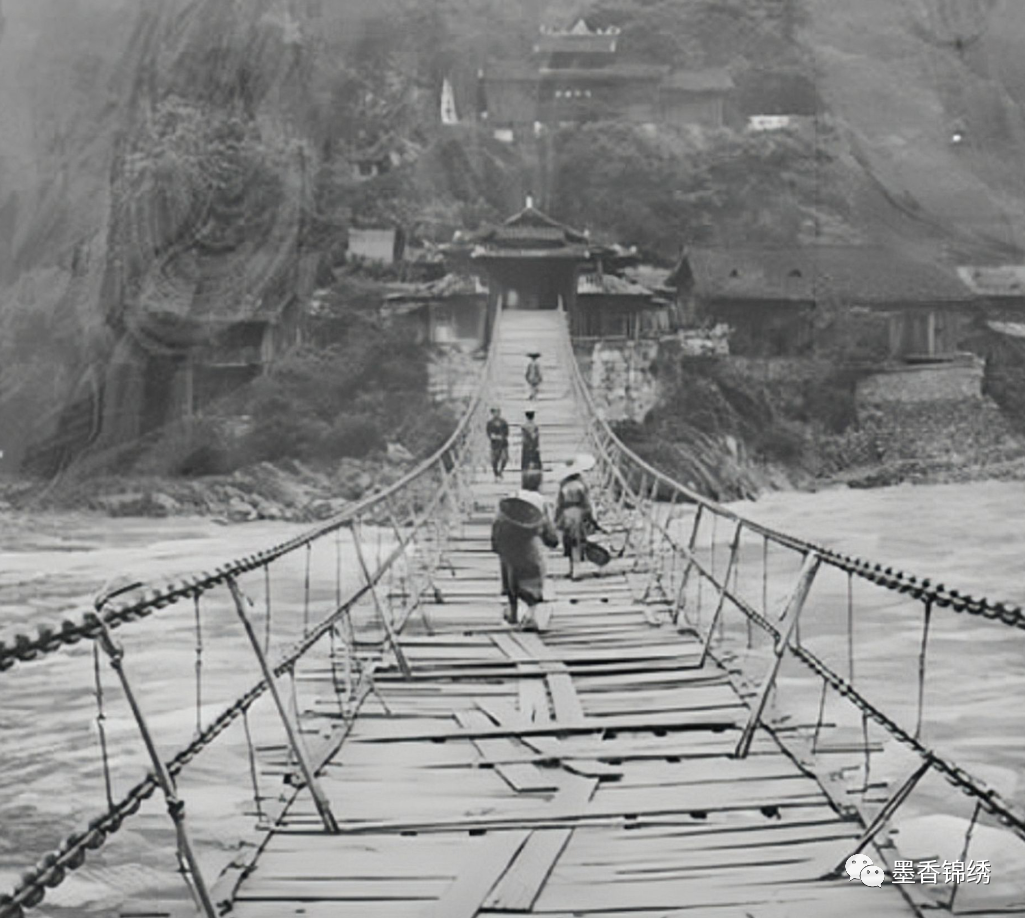 晚清1903年的四川大渡河上的泸定桥的罕见旧照,据历史书籍记载,四川的泸定桥建于康熙皇帝治下时期,乃是一座历经风雨岁月的古桥。泸定桥的全长有一百零三米,桥宽为三米,而整座桥则是由十三根铁链组成。老照片中的泸定桥下急流勇退,行人在上门担惊受怕,让人看了忍不住不寒而栗。