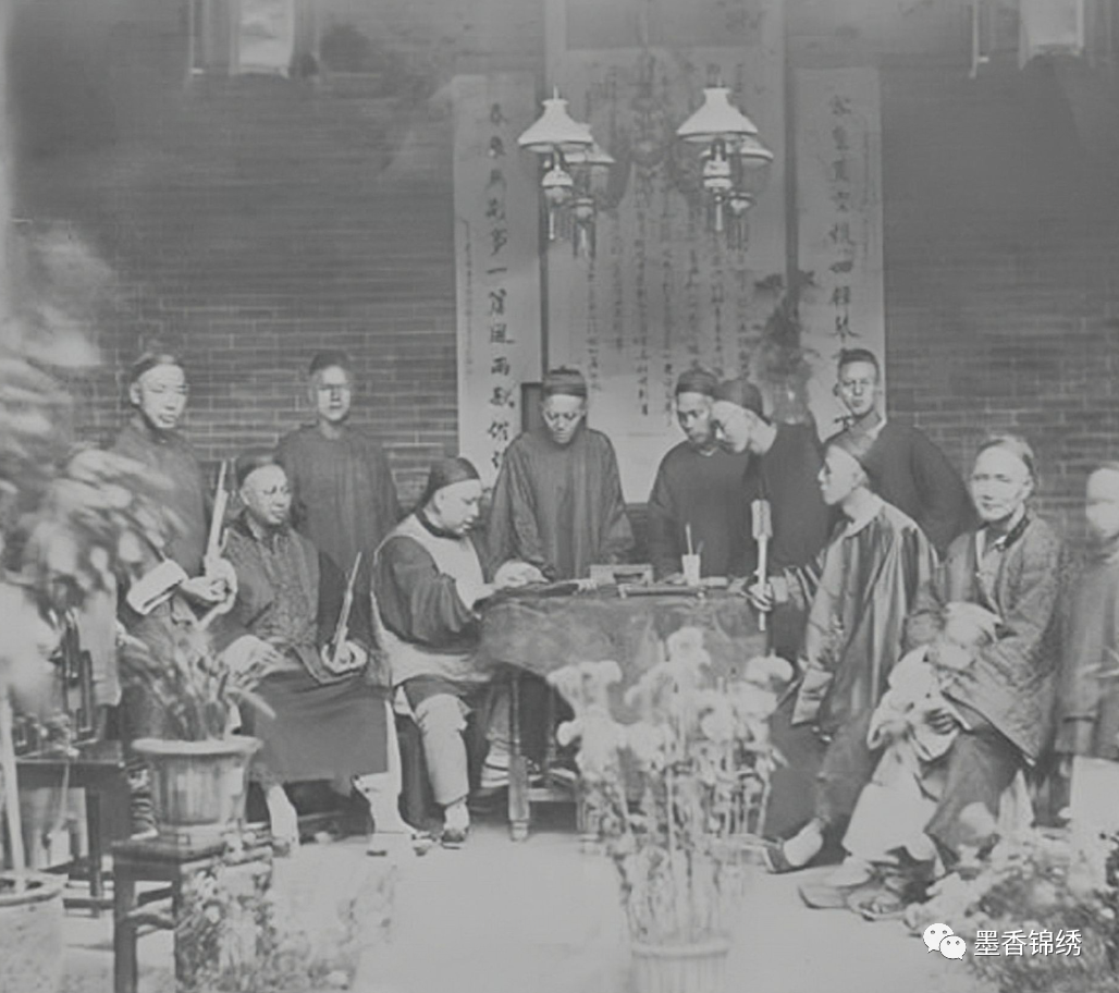 晚清时期的富商们坐在庭院谈笑风生的合影旧照,坐在一旁的女子乃是摄影师的妻子。这位外国摄影师在游历期间,经常与各个阶层的人士来往相交。即便是身居高位的朝廷大臣,或是贩夫走卒皆有接触。再加上他担任中法贸易之任,因此与周边的富商们更是来往密切。