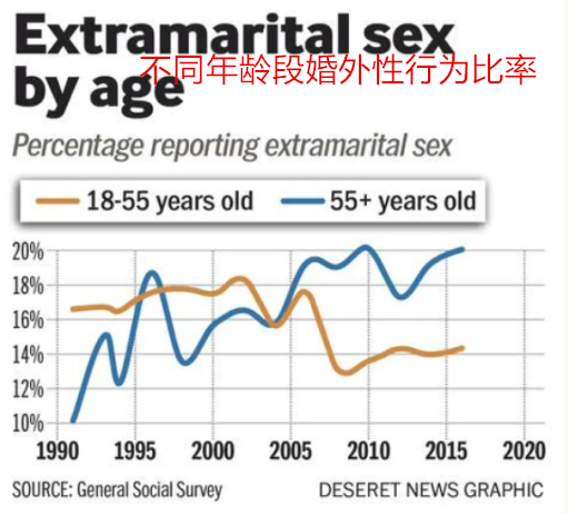 犹他大学社会学家尼古拉斯·沃尔芬格曾做过专项研究,自21世纪以来,老一辈对出轨更包容,20%的人坦承他们有出轨经历,而年轻群体这个数据仅14%。