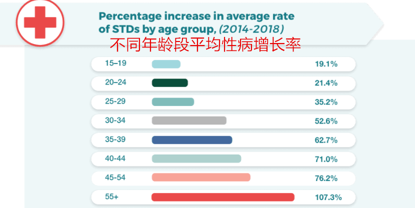 美国疾病控制与预防中心(CDC)2019 年统计数据显示, 2014 -2018 年间,55 岁及以上人群感染淋病病例上升了164%,梅毒病例上升了 120%,衣原体感染上升了 86%。