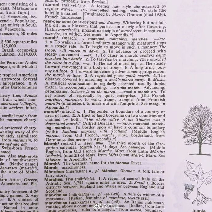 每一个月份单词都有来历,我们慢慢讲。因为March是战神马尔斯。March 当动词,是行军。March 放在音乐里,是行军时听的乐曲,因此指进行曲。martial,军事的,战争的。金庸写的那种武侠小说叫martial art。Martel 战锤......所以你看,单词和人一样,是有爸爸妈妈、爷爷奶奶、和祖先的。他是战神马尔斯,于是才有了后面的一切。