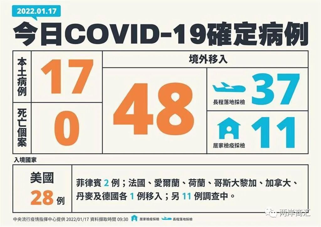 台湾流行疫情指挥中心17日公布新增65例COVID-19确定病例,分别为17例本土个案及48例境外移入;另确诊个案中无新增死亡。