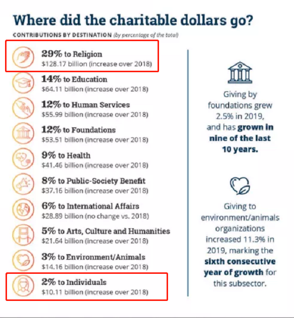 据《2020美国慈善捐赠报告》显示,美国的捐赠款大多用在宗教、基金会、教育等方面,特别是宗教,美国每年要将3成的捐款用在宗教上,用于个人救助的相对较少。