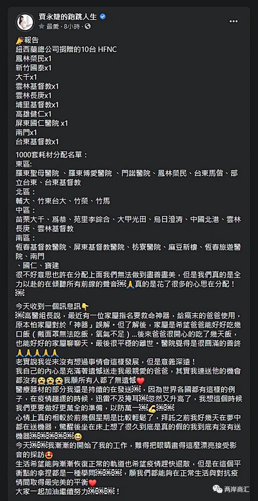 最终,贾永婕表示,近来看到疫情趋缓,心情确实轻松不少,之后她还是不停歇赠送医疗器材活动,