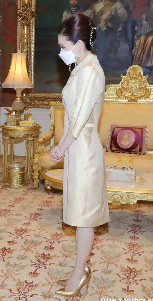 果然皇室就是有钱,金色套装金色高跟鞋,连口罩都带着珍珠。