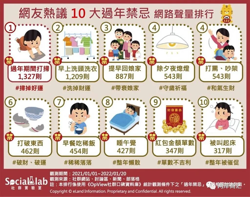 其中过年期间打扫、早上洗头洗衣、提早回娘家进入前三名,是大多数人认定的春节禁忌。