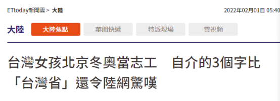 她今年加入北京冬奥会的赛事服务志愿者行列,并表示自己来自“台湾高雄市”。