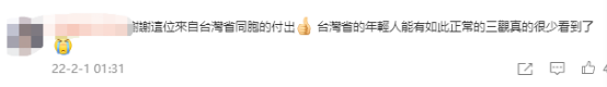 “谢谢这位来自台湾省同胞的付出,台湾省的年轻人能有如此正常的三观真的很少看到了”。