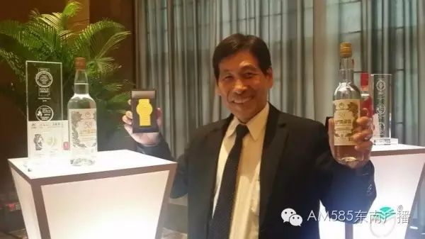 金门酒厂实业股份有限公司总经理车正国展示获得比利时布鲁塞尔世界食品质量评鉴大赛“特金奖”的58度金门高粱酒和金牌。