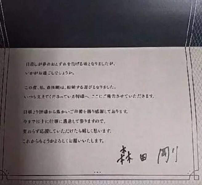 在2018年3月两人宣布结婚时,森田刚和宫泽理惠共同发表声明,