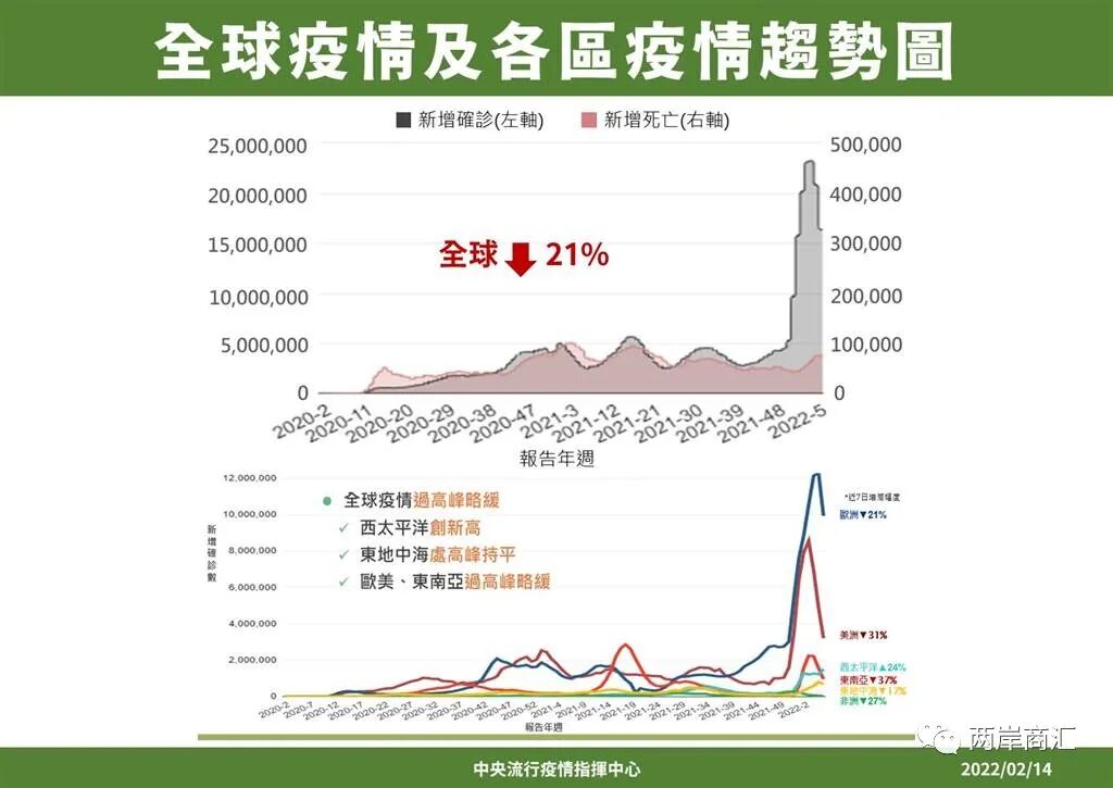 陈时中说,近期全球疫情从高峰略缓,美洲地区病例下降31%,欧洲降低21%,东南亚也在持续下降,
