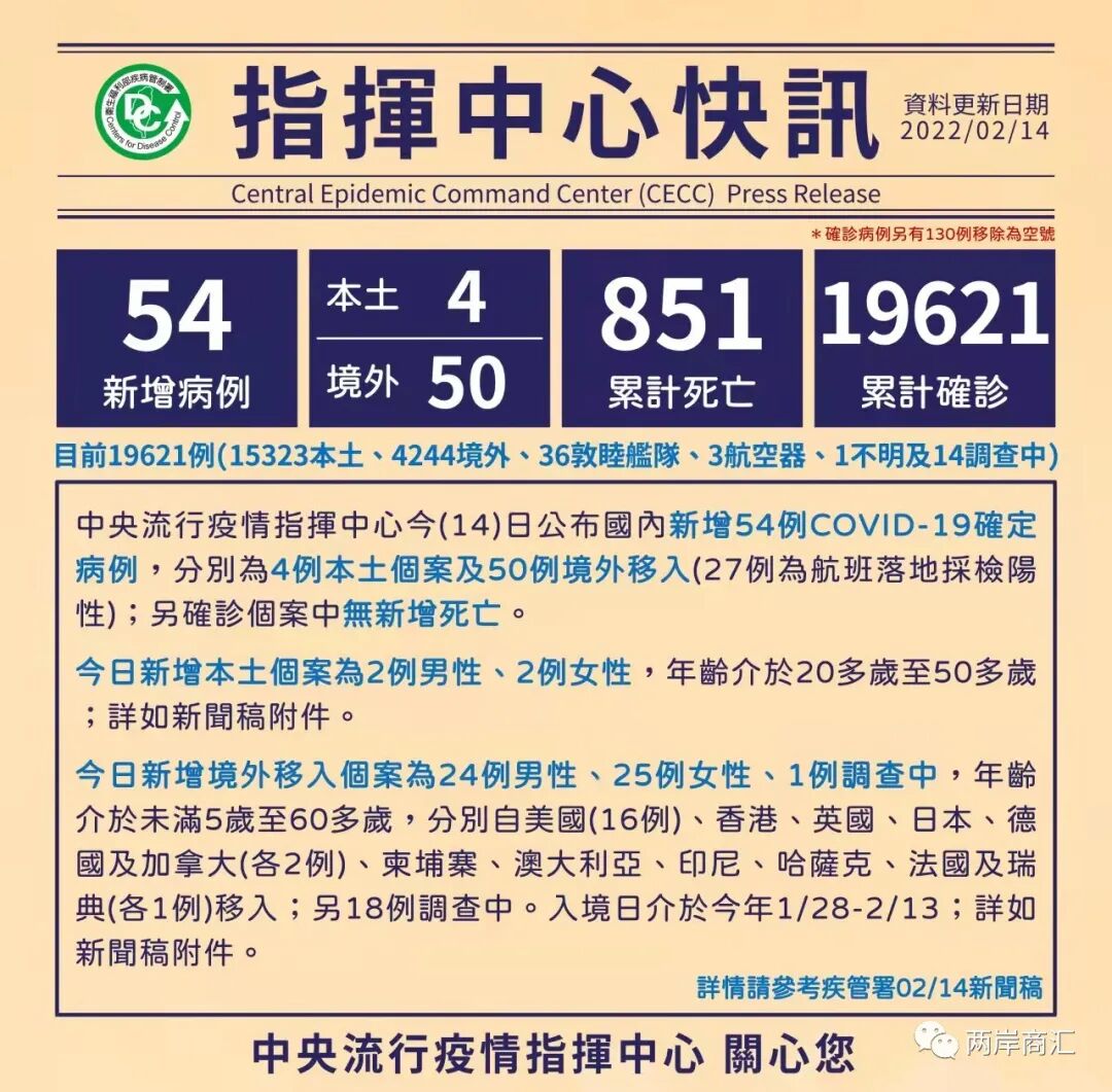 台湾流行疫情指挥中心(14)日公布新增54例COVID-19确定病例,