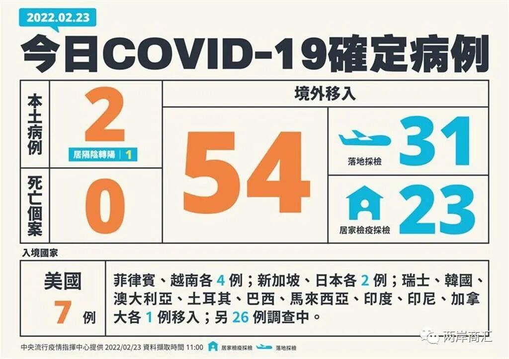 台湾流行疫情指挥中心公布新增56名个案,分别为本土2例,境外54例。