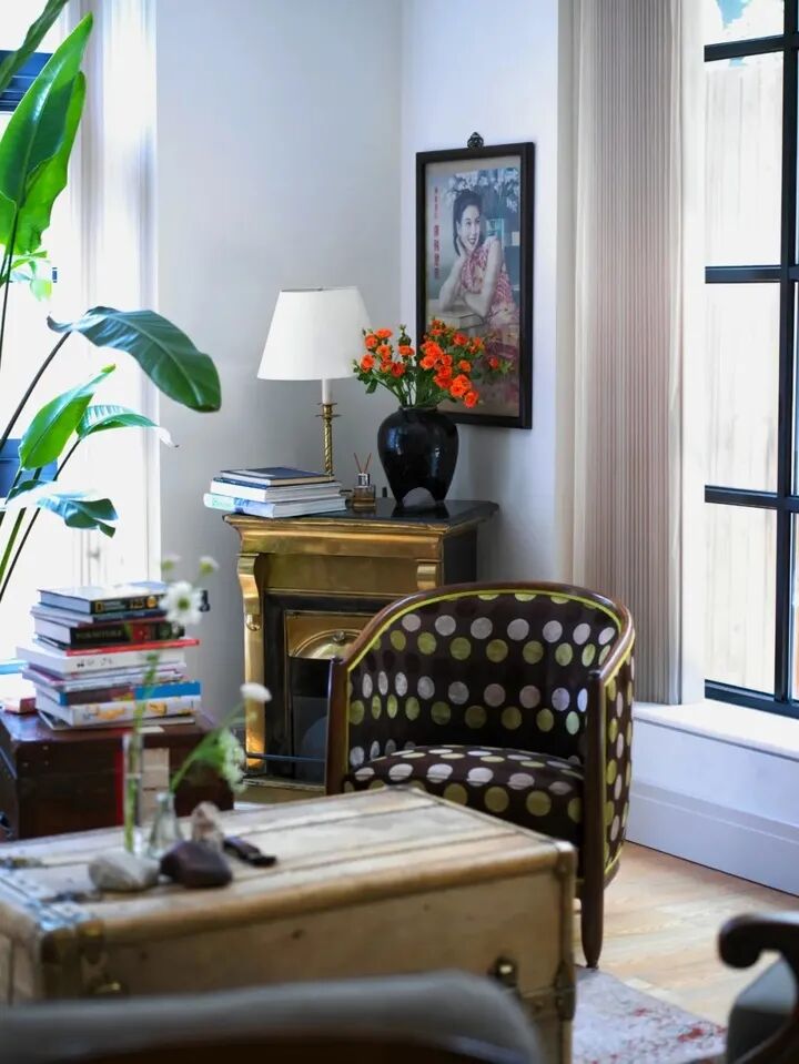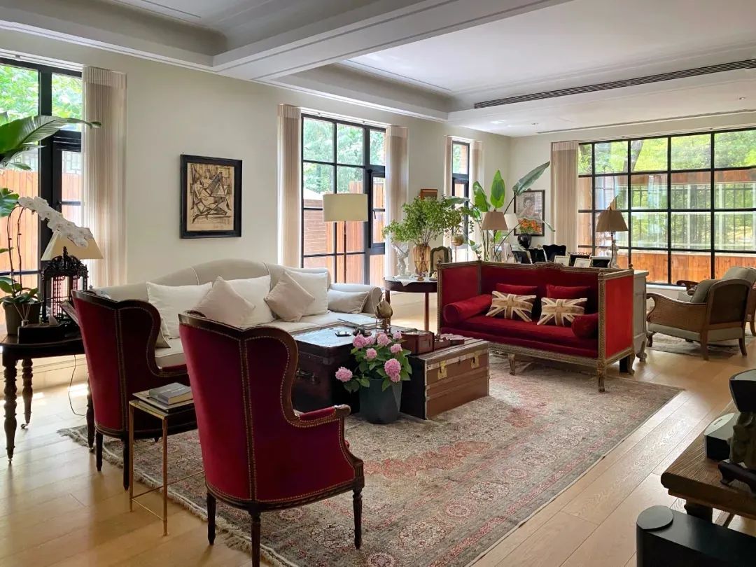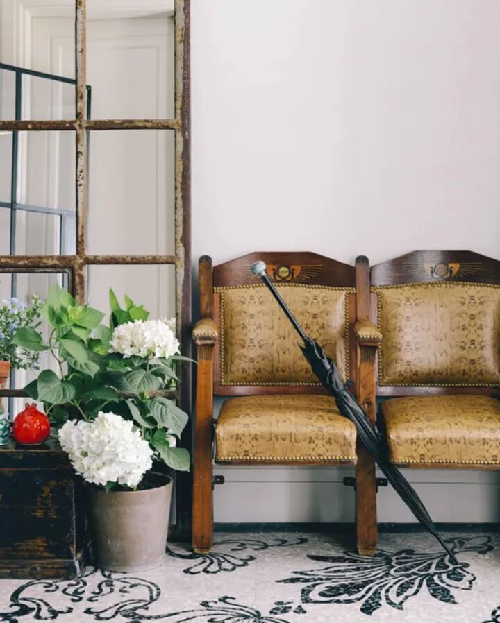 玄关处,有一对很有特色的椅子,每次有客人来,总会被这对椅子吸引目光。这对椅子看起来很复古,因为就是张静初从美国一家百年历史的电影院里淘回来的。