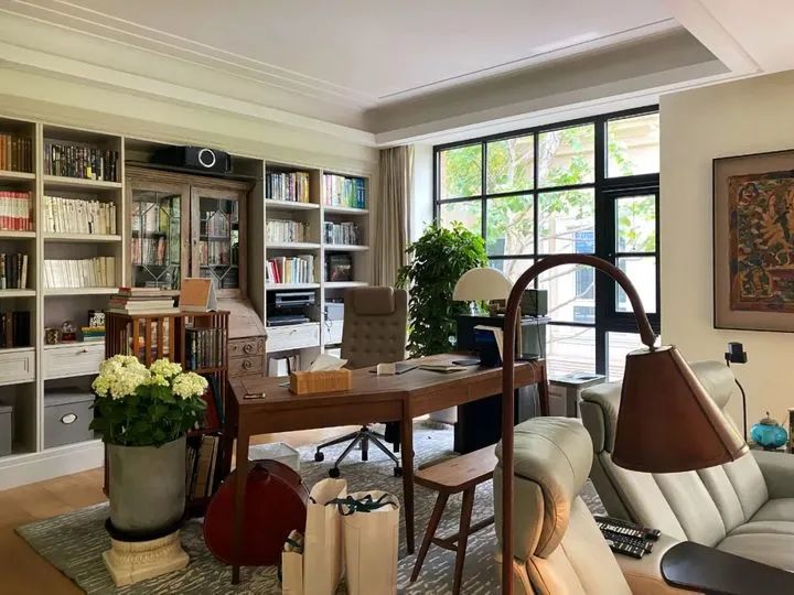 二楼有一个书房,嵌入式的书柜,布局精巧,书籍密密麻麻地摆放着,看着就有一种弥漫的书香气。