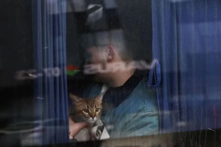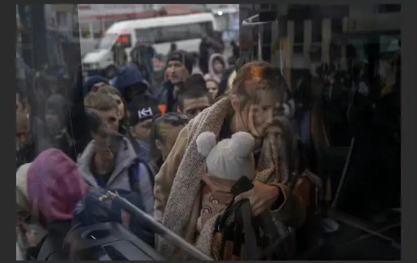 一位妇女抱着她的孩子挤上了一辆离开基辅的汽车,空袭令所有人产生恐惧。