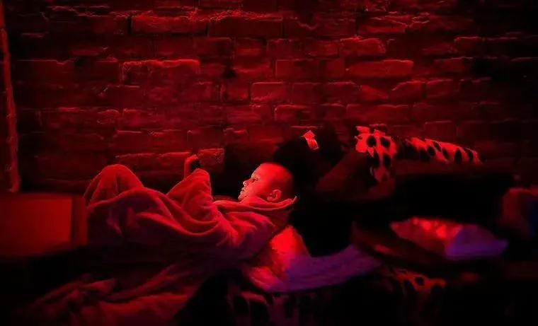 一名六岁男孩,在避难所玩着平板电脑,他不知道这个夜晚为什么会这样。
