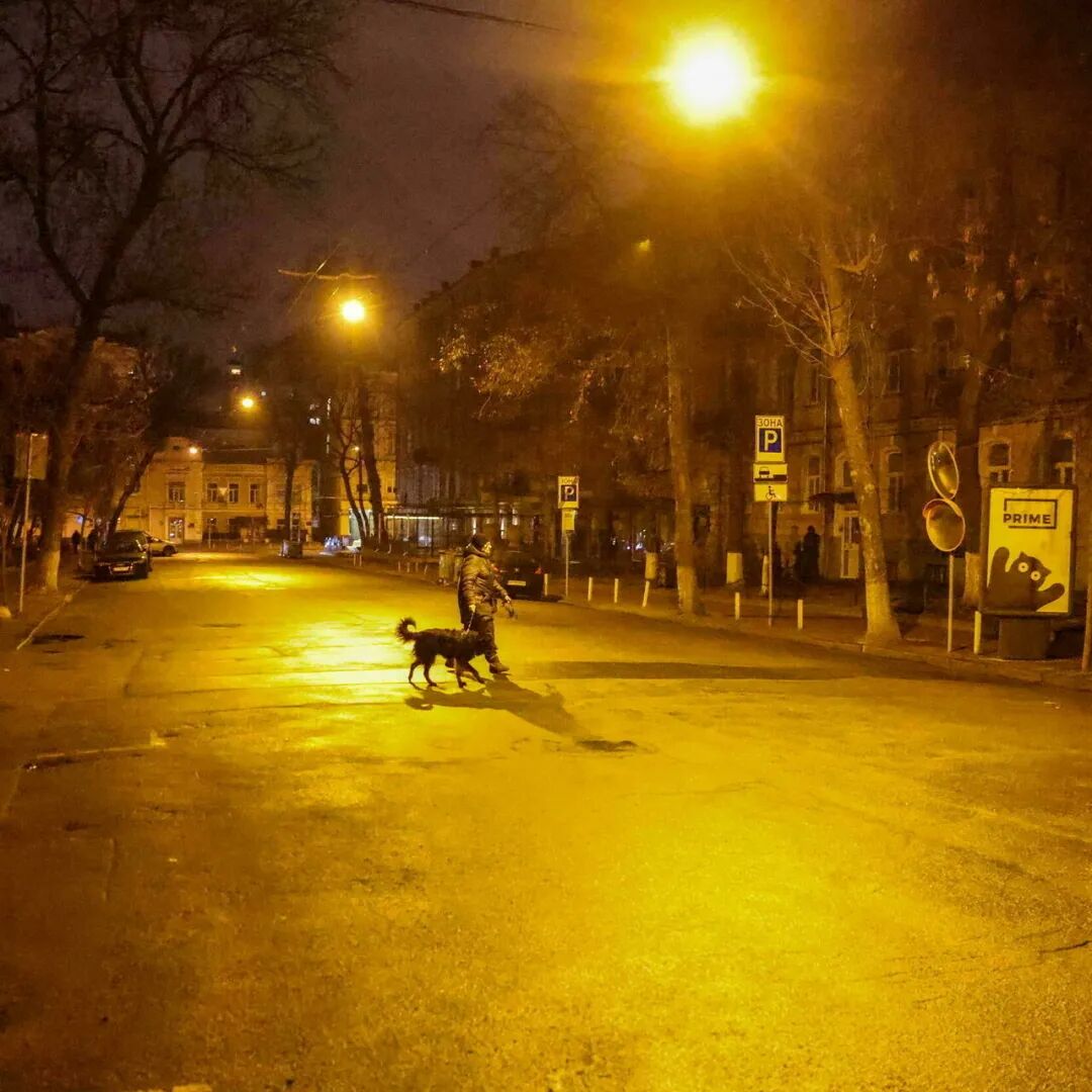 一位基辅市民赶在宵禁开始前,匆匆遛狗。