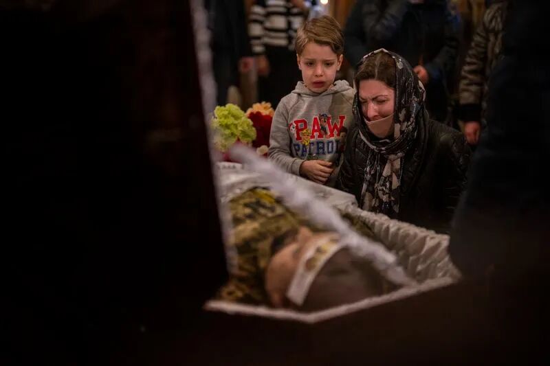 另一边,是一场葬礼,35 岁的乌克兰陆军上尉Anton Sydorov在战斗中牺牲,留下一对孤儿寡母。