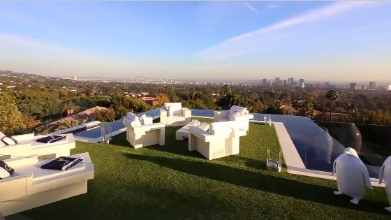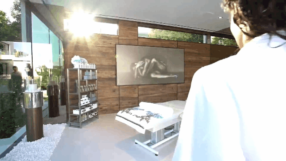 在泳池的一边还设计了一面巨大的4k电视屏幕