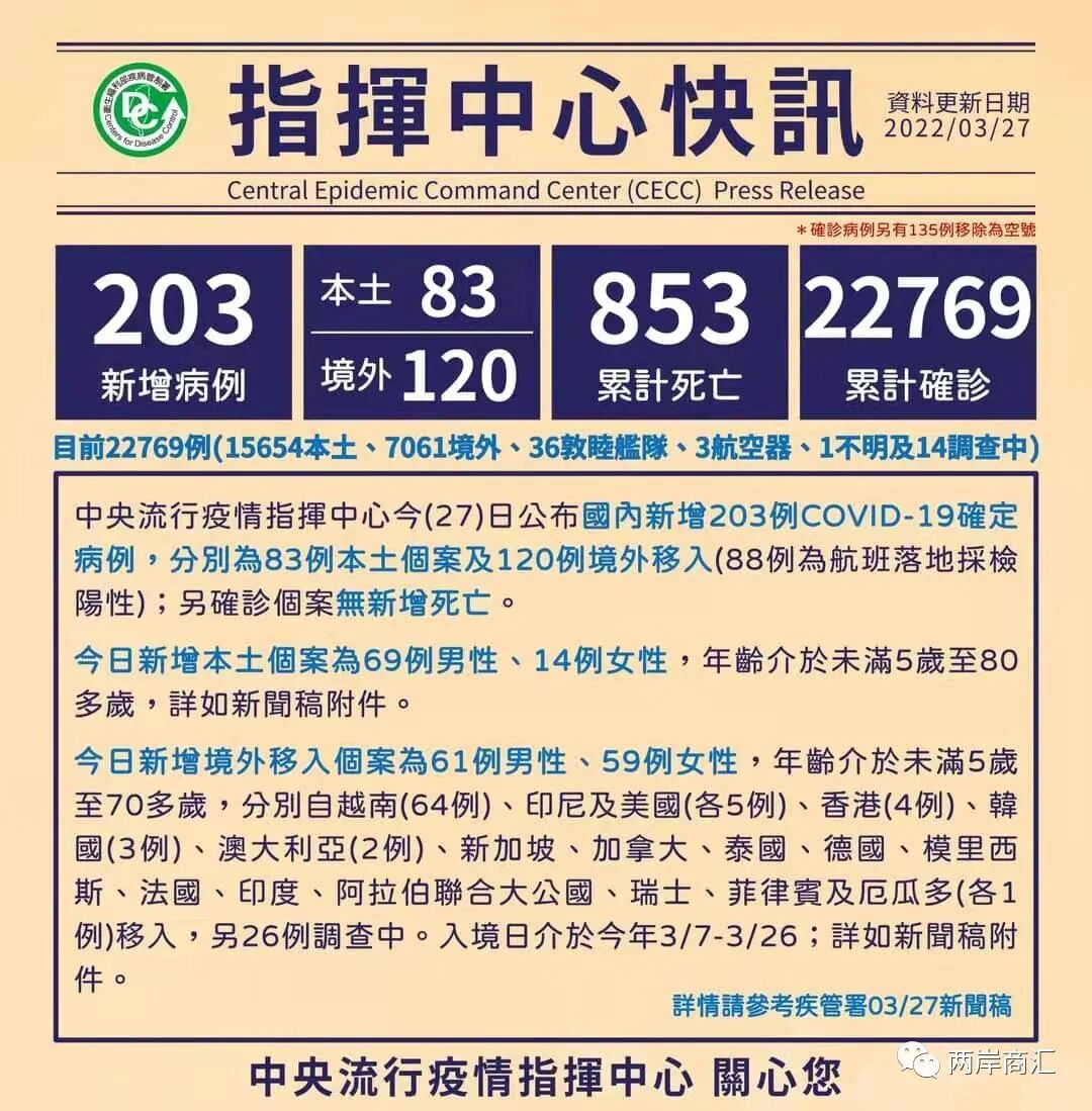 台湾本土疫情今天拉警报,各县市多点爆发,流行疫情指挥中心公布,共新增83例,境外移入确诊为120例,超过两百多例确诊个案,