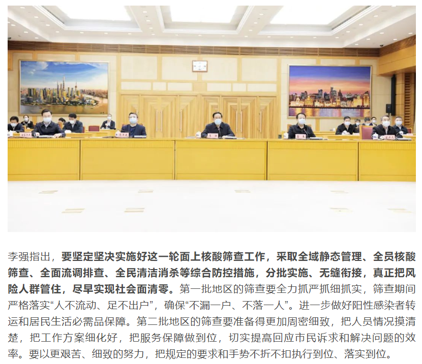 要坚定坚决实施好这一轮面上核酸筛查工作,采取全域静态管理、全员核酸筛查、全面流调排查、全民清洁消杀等综合防控措施,分批实施、无缝衔接,真正把风险人群管住,尽早实现社会面清零。