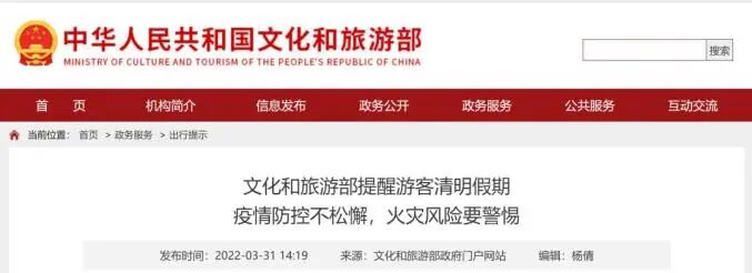 因此,文化和旅游部提醒广大游客,出游期间疫情防控不松懈、火灾风险要警惕。