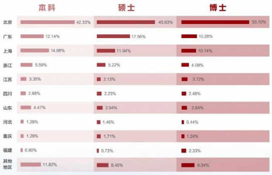 北京大学来看,本科、硕士学历的毕业生分别有42.33%和45.63%选择留京,而博士毕业生留京比例则超过一半,高达53.1%。