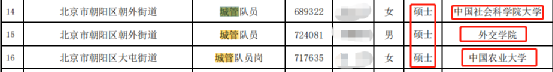 朝外街道此次拟录用两名“城管队员”,都是硕士,一名来自中国社会科学院大学,另一名来自祖国“外交家摇篮”外交学院。