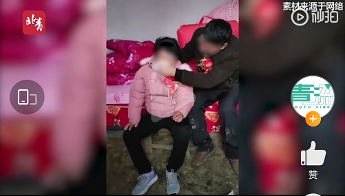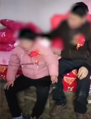 视频里,一对胸前戴着红花的男女坐在一起,看上去还未成年的女孩坐在小板凳上痛哭,旁边那个看上去像她爸的人,拿出一张纸,给她擦眼泪和鼻涕。