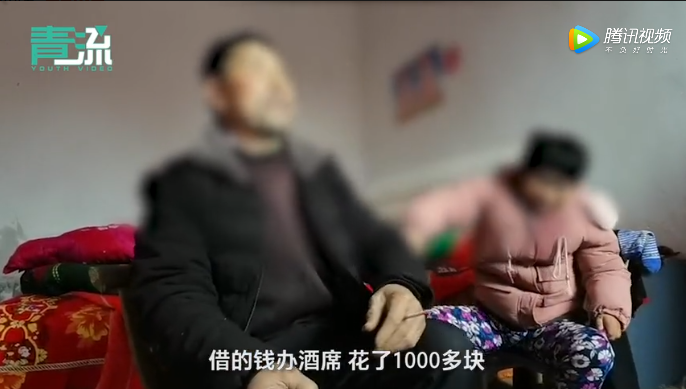 为了这场婚礼,老汉借钱办了三桌酒席,找了两辆车,将女孩接到家中。