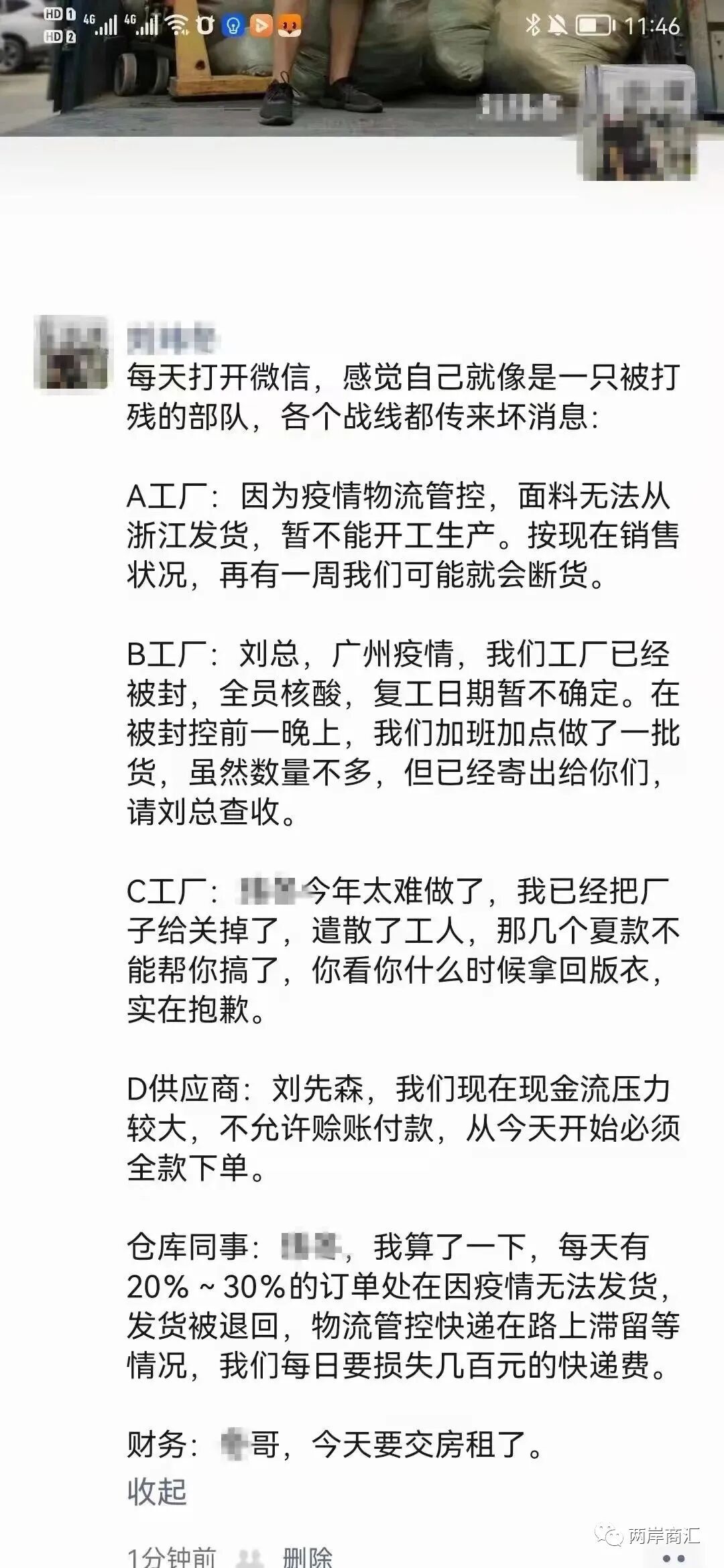 A工厂:因为疫情物流被管控,面料无法从浙江发货,暂不能开工生产,按现在的销售状况,再有一周我们可能就会断货。