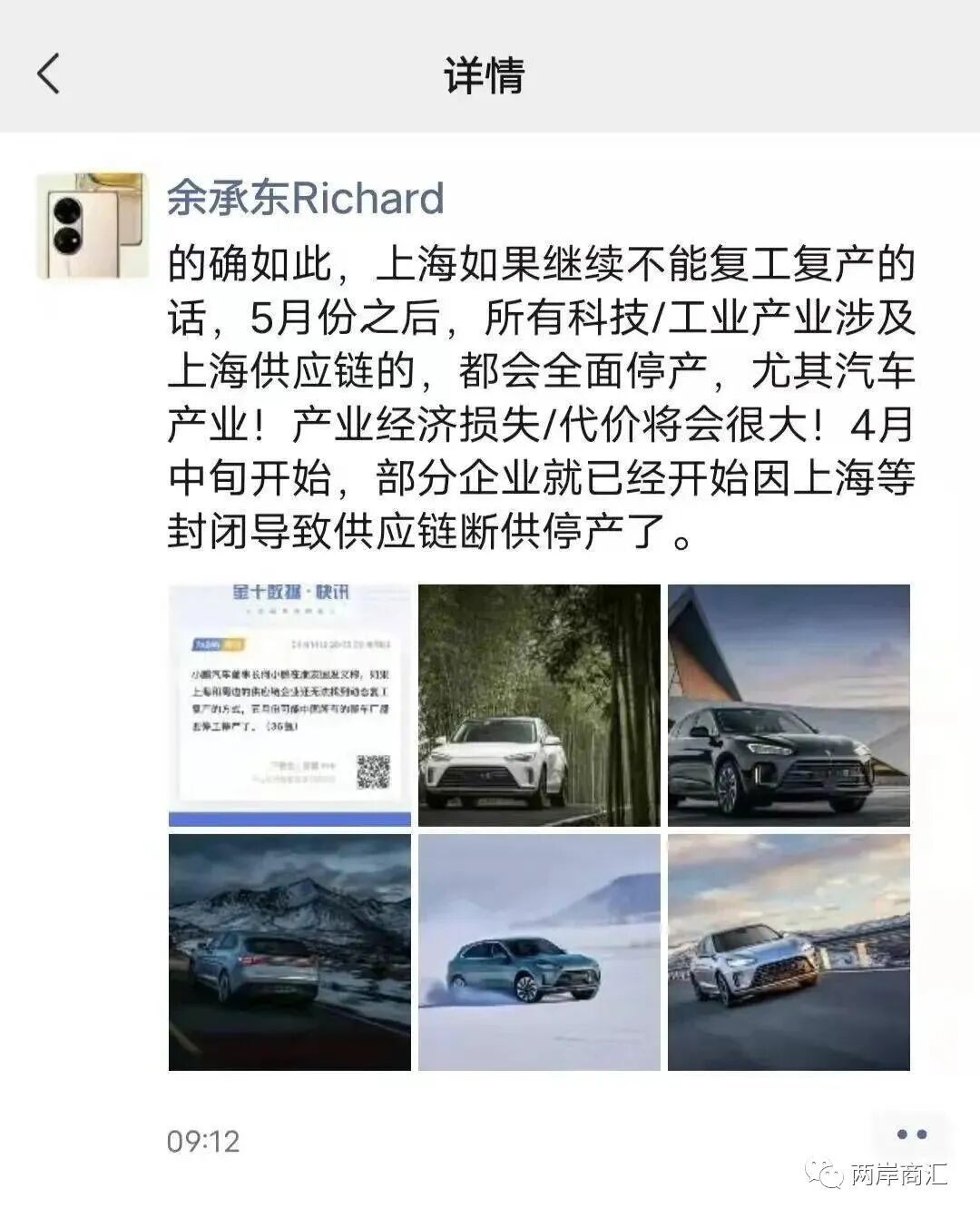 “上海如果不能复工复产的话,5月份之后,所有科技、工业产业涉及上海供应链的,都会全面停产,尤其汽车产业。”