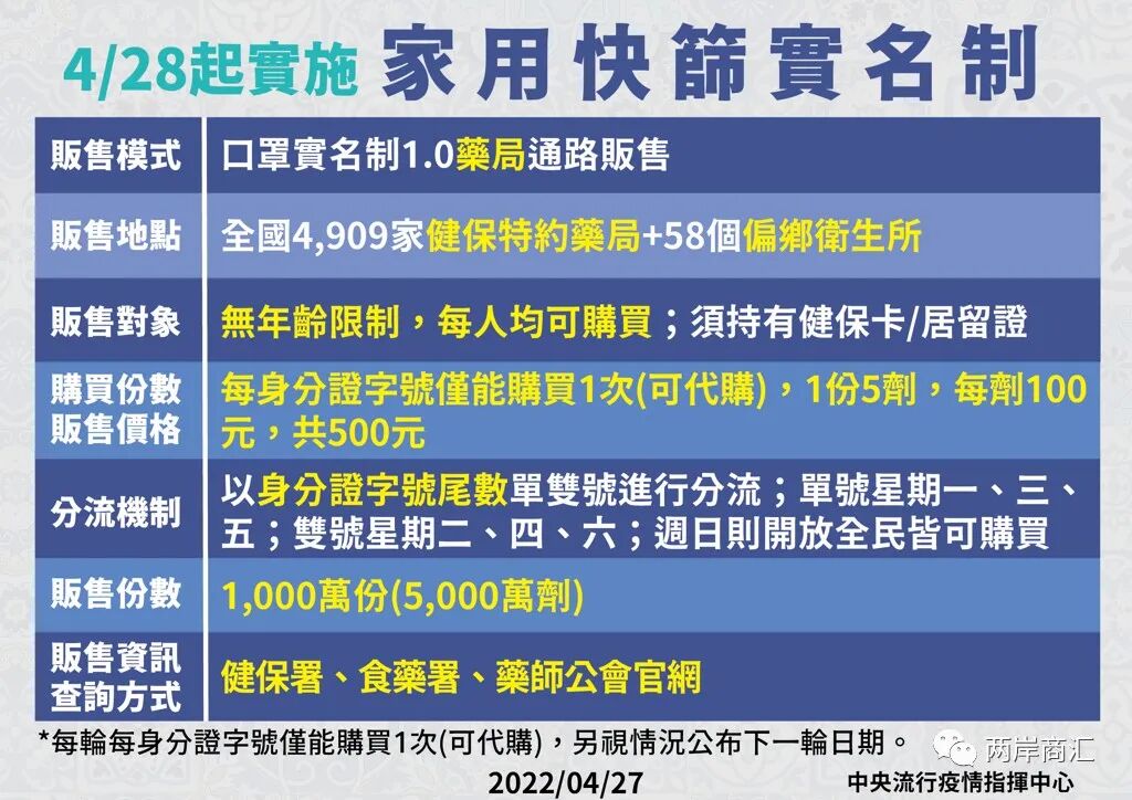 疫情急速上升,民众对于家用快筛试剂的需求增加,流行疫情指挥中心(27)日宣布家用快筛试剂贩售实名制自(2022)年4月28日上路,